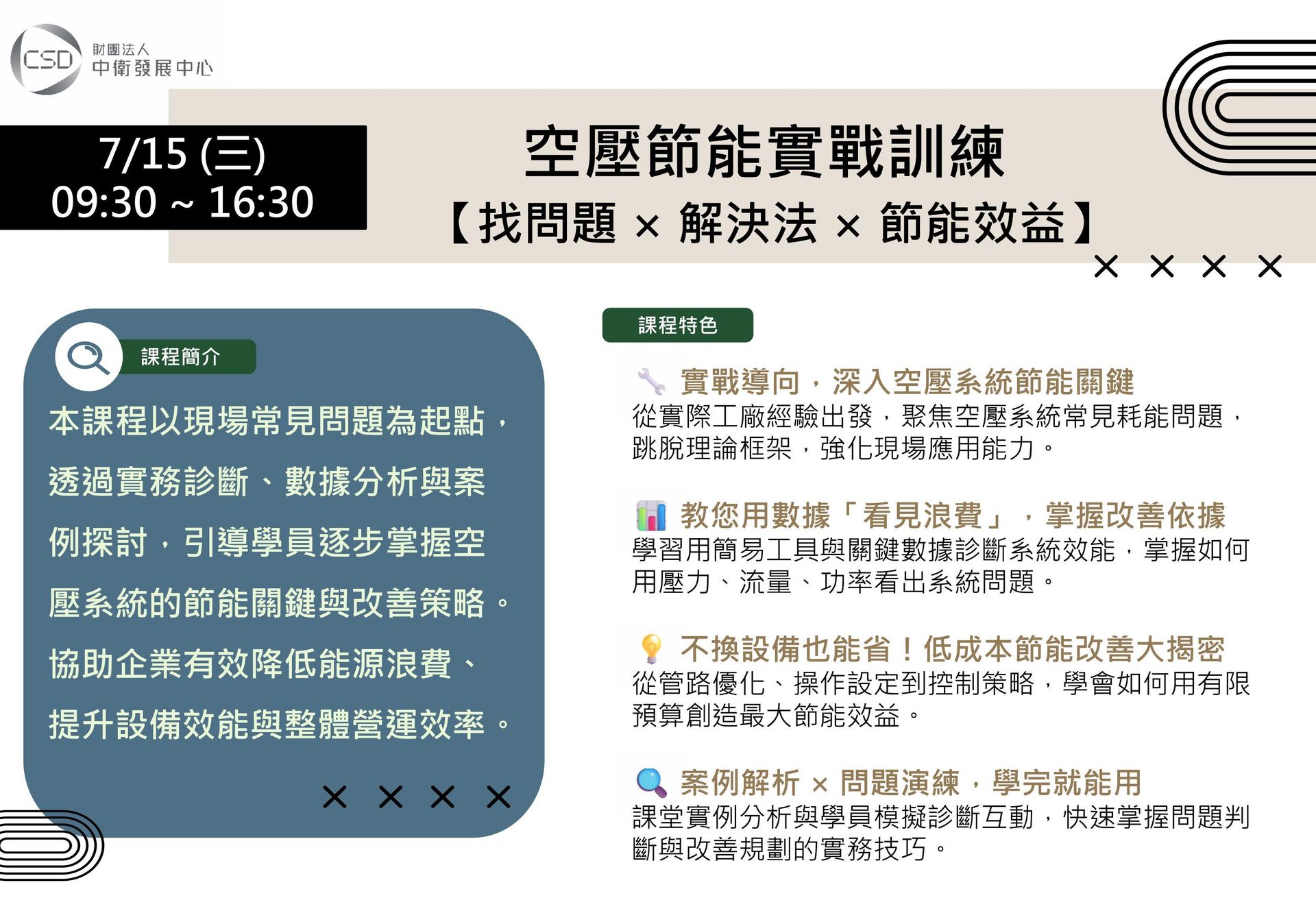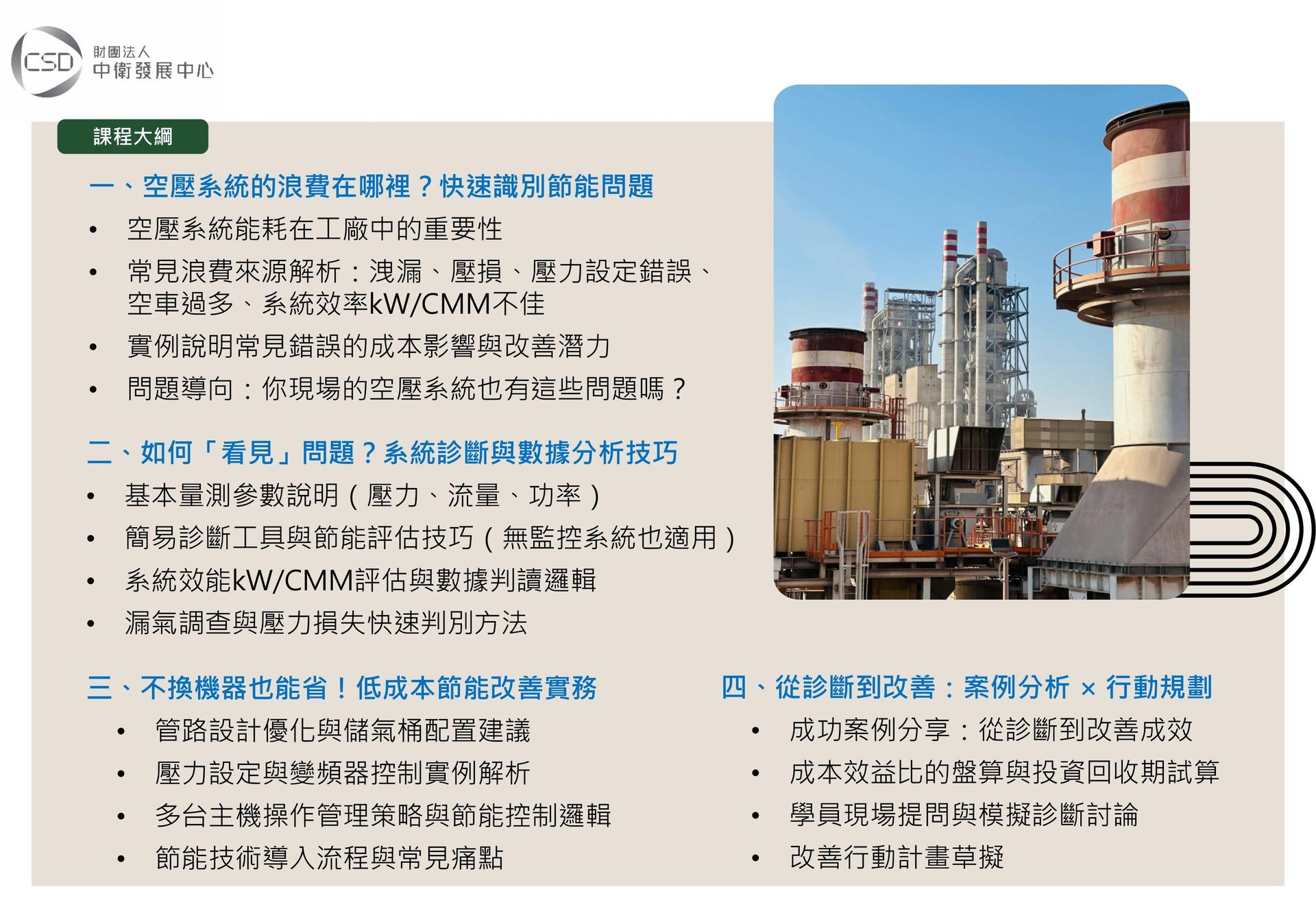 本課程以現場常見問題為起點,透過實務診斷、數據分析與案例探討,引導學員逐步掌握空壓系統的節能關鍵與改善策略。協助企業有效降低能源浪費、提升設備效能與整體營運效率。