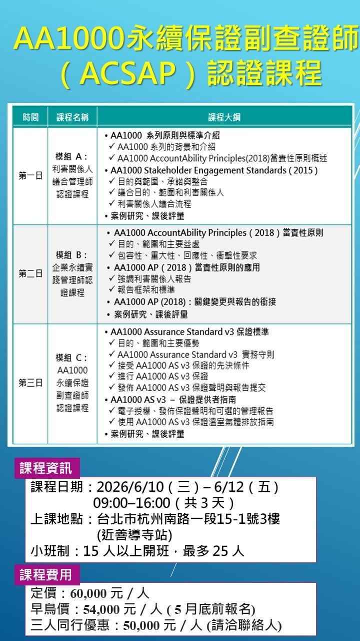 台灣企業 (含上市櫃) 及越來越多國外企業和政府機構已經納入 AA1000 標準,以評估並改進其永續發展表現。 透過AA1000之A.B.C認證課程,建立AA框架標準、報告標準及審核標準之知識及查證技巧外,並取得AA1000 ACSAP證書。