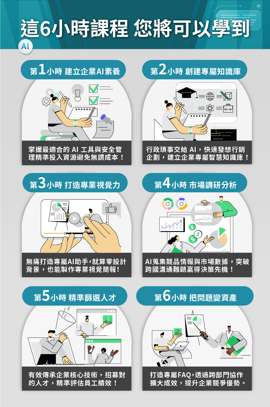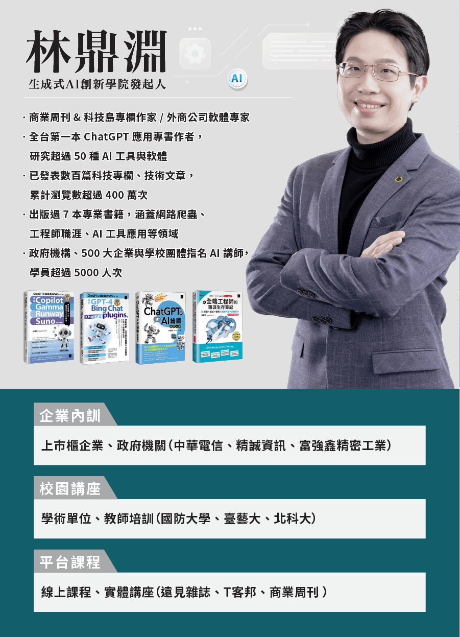 由知名企業指定的 AI 講師林鼎淵為中小企業量身定做《 AI 實戰課》,除了乾貨滿滿的課程內容、精心編排的課程講義,完整 6 小時的課程涵蓋 12 個企業應用範例,而且每個範例都有搭配實戰演練,針對企業痛點對症下藥,找出一套 AI 解方,讓你輕鬆掌握職場致勝關鍵!