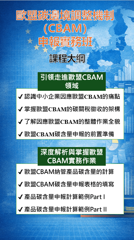 本課程以「企業實際可落地執行」為核心設計,從 CBAM 政策背景、碳關稅徵收架構,到碳含量計算與申報表實務操作,協助企業快速建立 CBAM 因應能力。