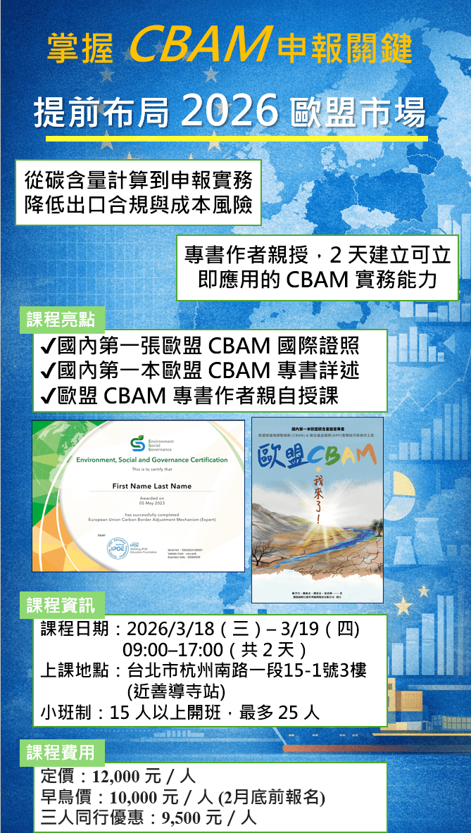 2026 年起,未能有效掌握產品碳含量與申報機制的企業,將直接承擔額外碳成本風險。 一張歐盟 CBAM 專業能力國際認證證書,將成為 2026 年後的關鍵職場競爭力。