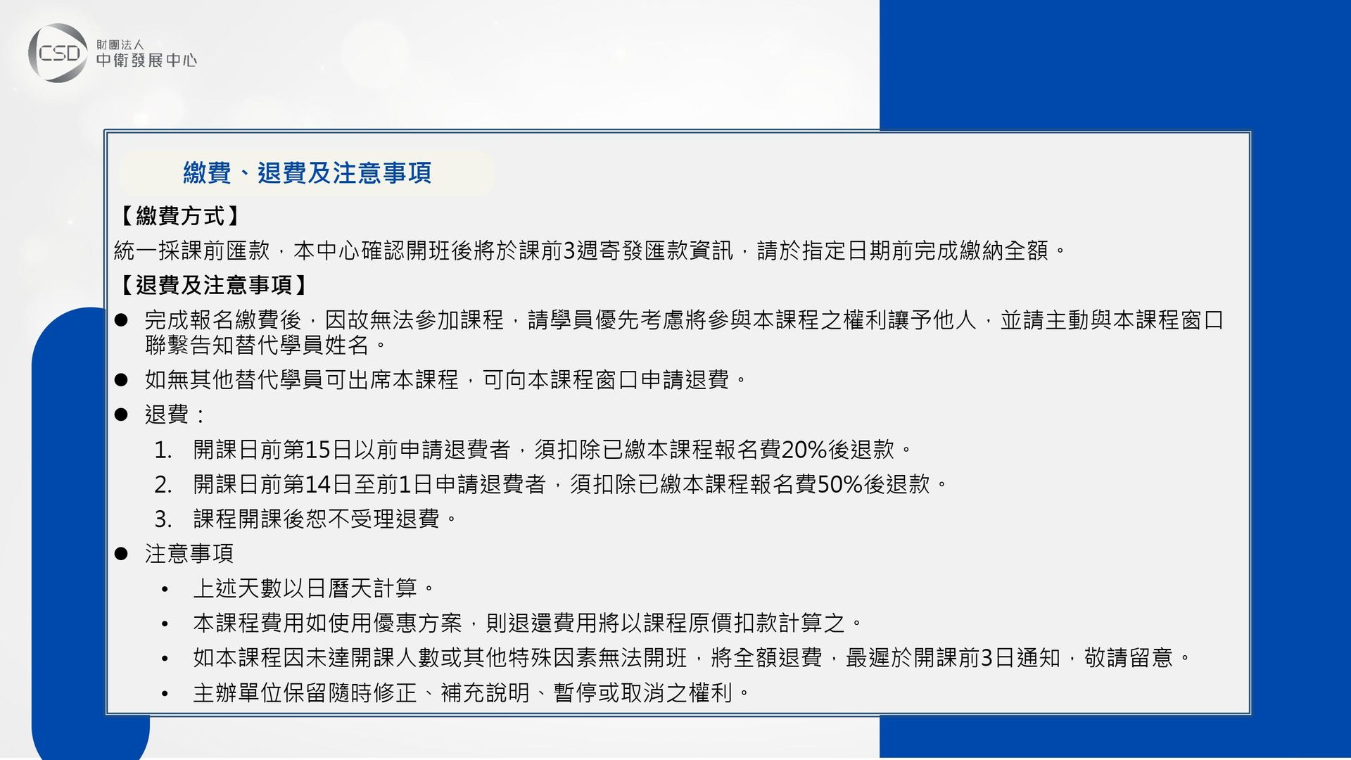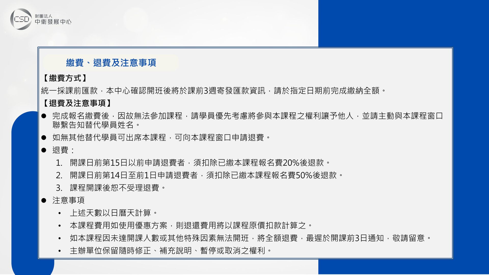 繳費方式:統一採課前匯款,本中心確認開班後將於課前3週寄發匯款資訊,請於指定日期前完成繳納全額。