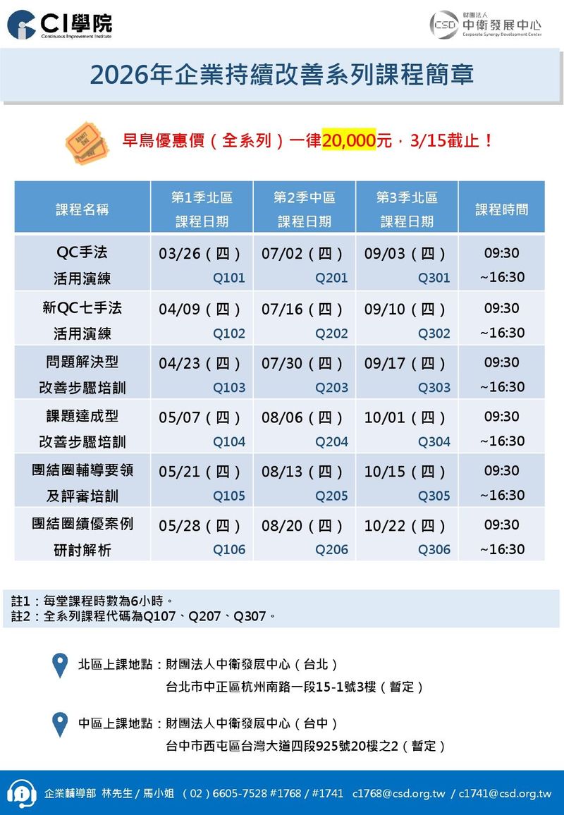 想讓品質管理更高效、更有趣?歡迎加入「持續改善系列課程」,六堂精選課程帶您全面升級!課程涵蓋QC手法、新QC七手法的靈活應用,結合問題解決與課題達成的實務技巧,搭配團結圈活動的輔導案例與績優案例剖析,讓您掌握品質改善的核心祕訣。不論您是企業或醫院品質部門專業人員,還是想挑戰輔導員證照的實力派,CI學院都是您的最佳選擇!透過實戰演練與專業指導,圈長、圈員共同參與,讓您和團隊一起突破瓶頸,輕鬆實現持續改善,攜手邁向卓越!