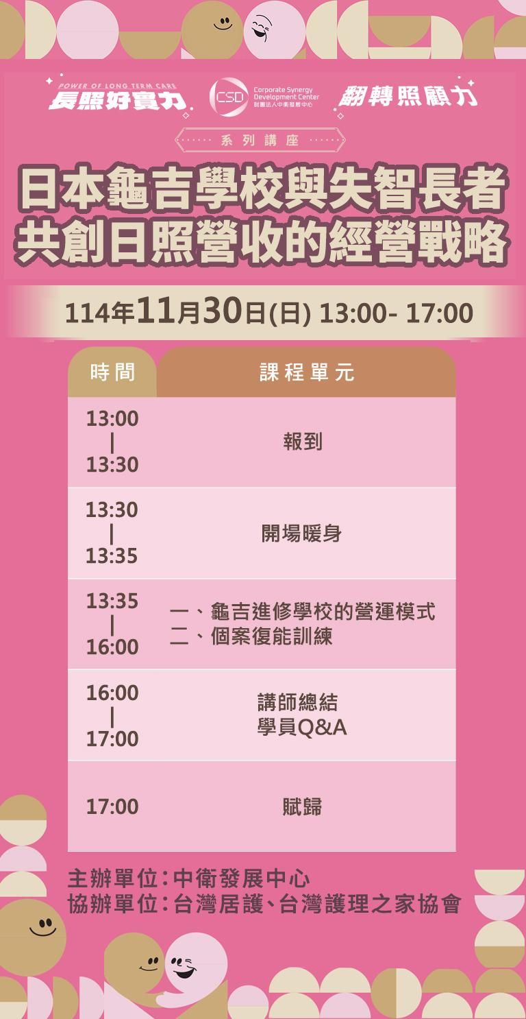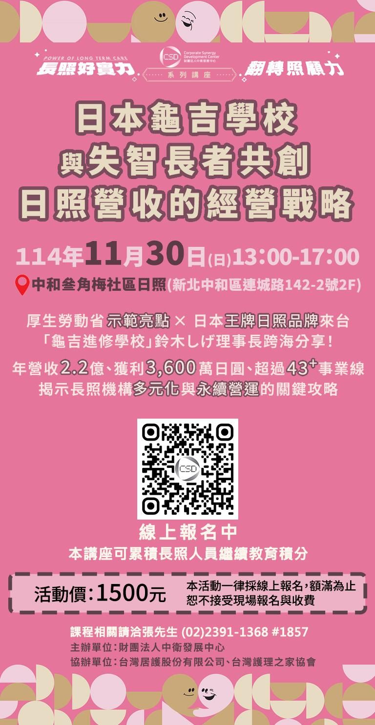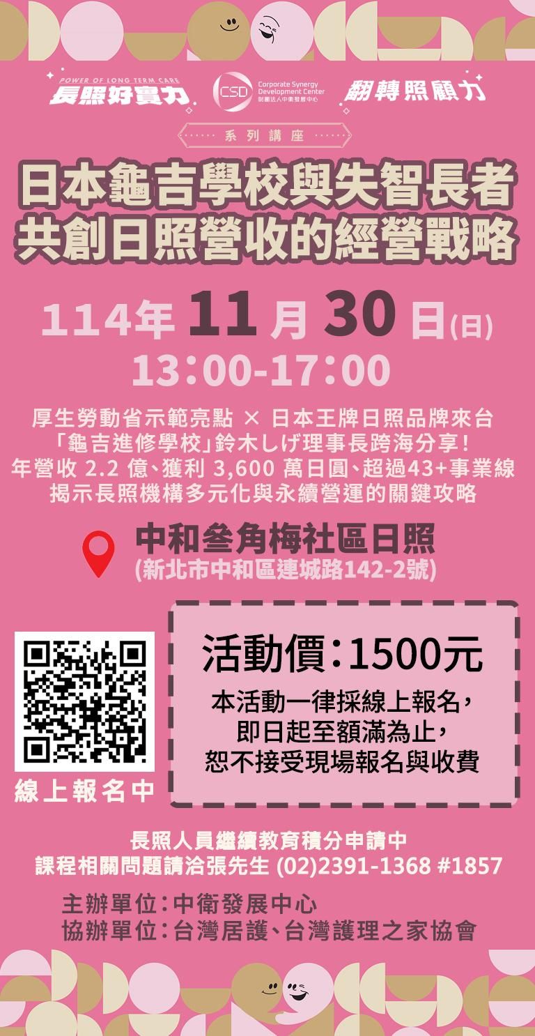 長照經營 日照中心 永續營運 長照賺錢 龜吉學校 失智長者 經營戰略 長照多角化 中衛發展中心 繼續教育積分 新北長照講座 2025年11月30日 中和與叁角梅社區日照 長照獲利 復能訓練 鈴木しげ