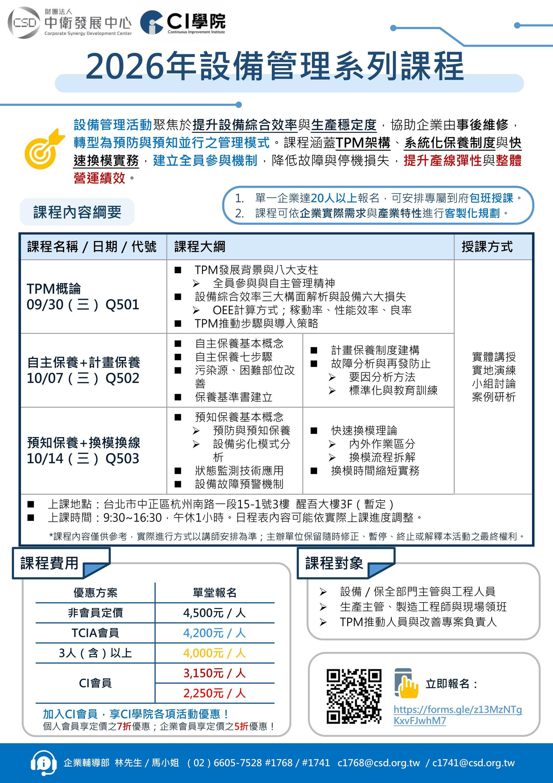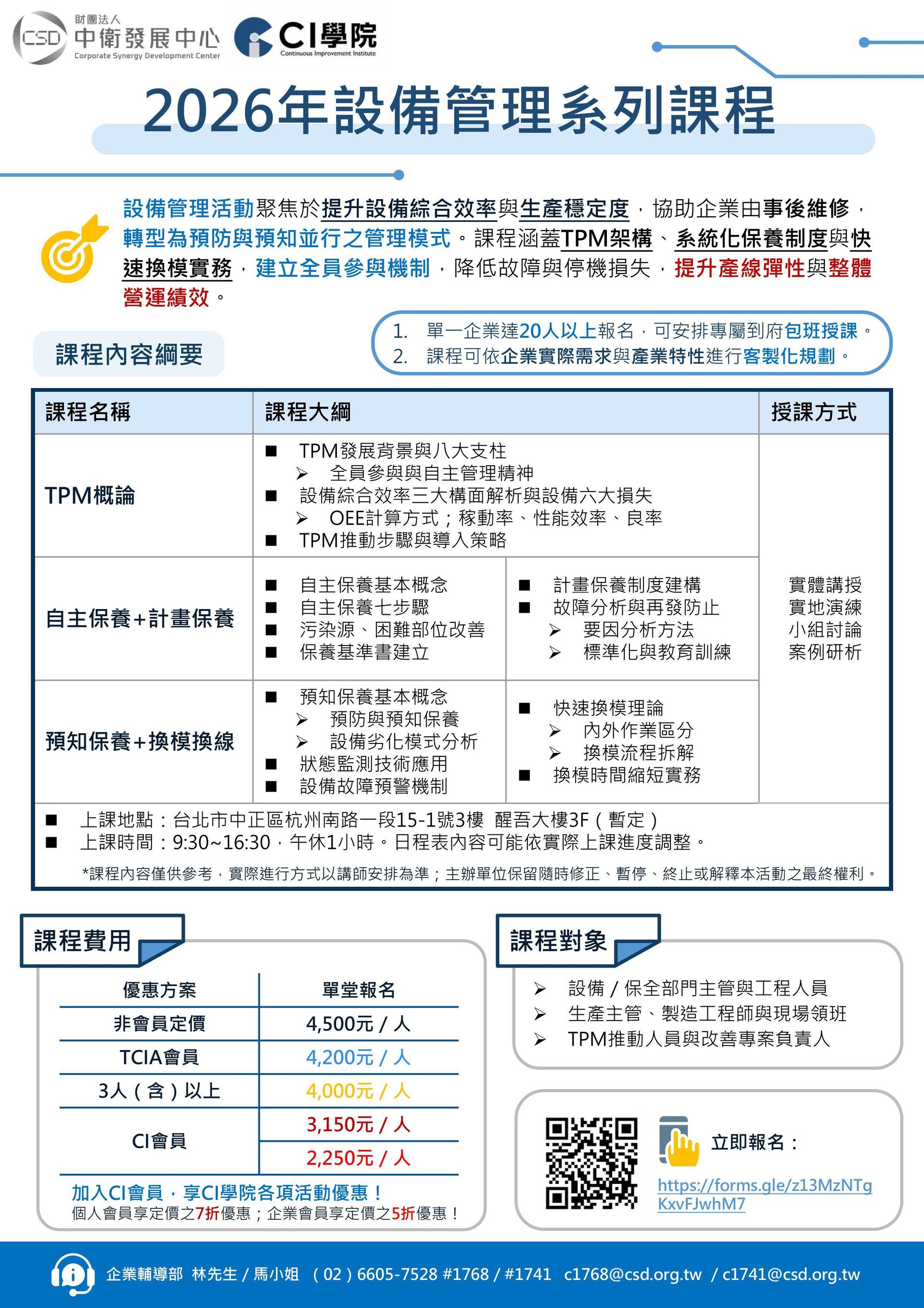 課程內容涵蓋TPM基礎觀念、自主與計畫保養制度建構,以及預知保養與快速換模實務應用,從制度面到現場執行全面強化管理能力。