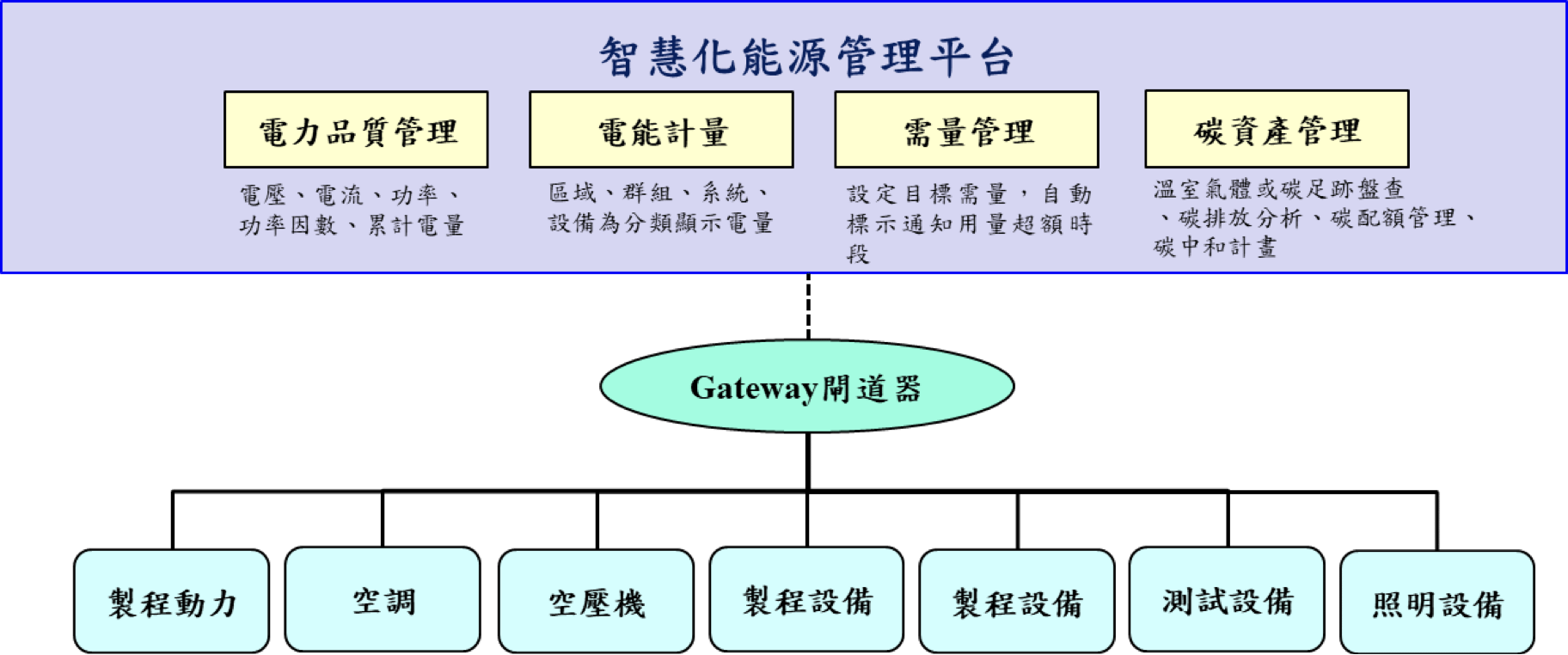 一般智慧能源管理系統規劃可分用能數據蒐集並透過通訊方式將數據匯入後台(雲端或地端)的智慧能源管理系統,分別說明如下: