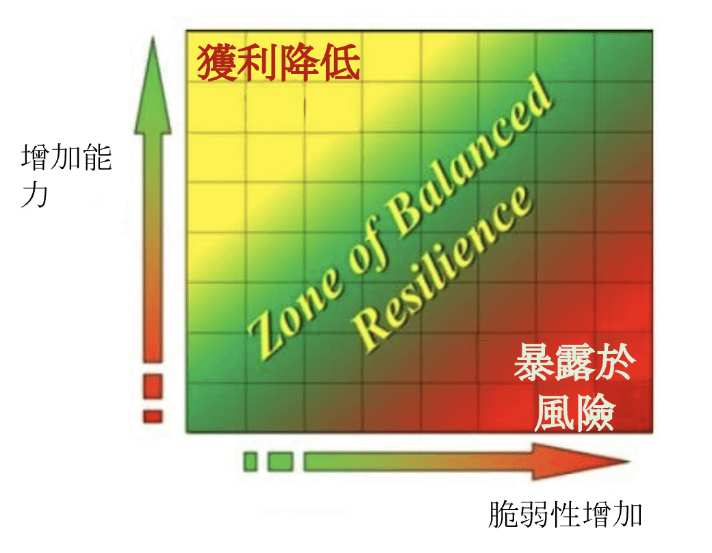 以二維象限(如圖所示)來看,若企業沒有足夠的能力,會讓企業面臨脆弱性,並讓企業暴露在風險中(右下角),若企業過度投資在沒必要的能力上,會使企業獲利降低。 圖中綠色區塊即為最適韌性區間: 在不降低獲利下減緩供應鏈風險。因此組織應朝向最適性區域來發展以取得平衡。其中脆弱性共分為7大要素:動盪性、蓄意的威脅、外部壓力、資源限制、靈敏度、供應商/客戶斷鏈、連結性。能力共有14項要素:採購的靈活度、履行訂單的靈活度、生產能力、效率、可視化、適應性、預期性、復原性、分散性、協同合作、組織、市場定位、安全性、財務韌性。組織需靈活運用評估工具,不斷的從事組織學習與變革,讓企業能夠達到「精益求精,不止於至善」,追求真正的永續卓越經營。